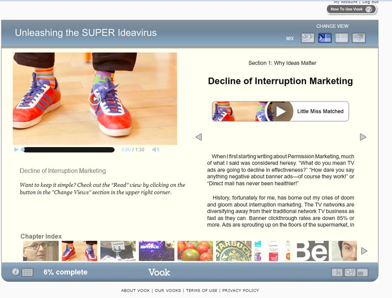 I’m about halfway through the desktop version of Unleashing the SUPER Ideavirus Vook by Seth Godin. I turn pages using arrow buttons, can switch between full-screen text, full-screen video or a hybrid of both, and each chapter has a play button for a short 1-2 minute video that features people embracing the ideas of the chapter.